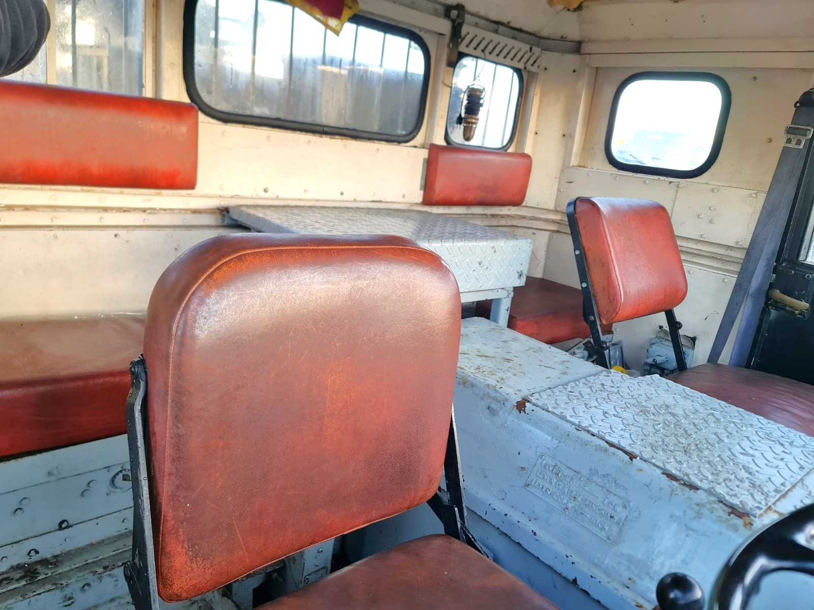 Features: Spacious interior with crew seating, rear-mounted fully operational recovery crane system, leather seats, metal dashboard, rear spare wheel, classic steel construction, patina interior finish